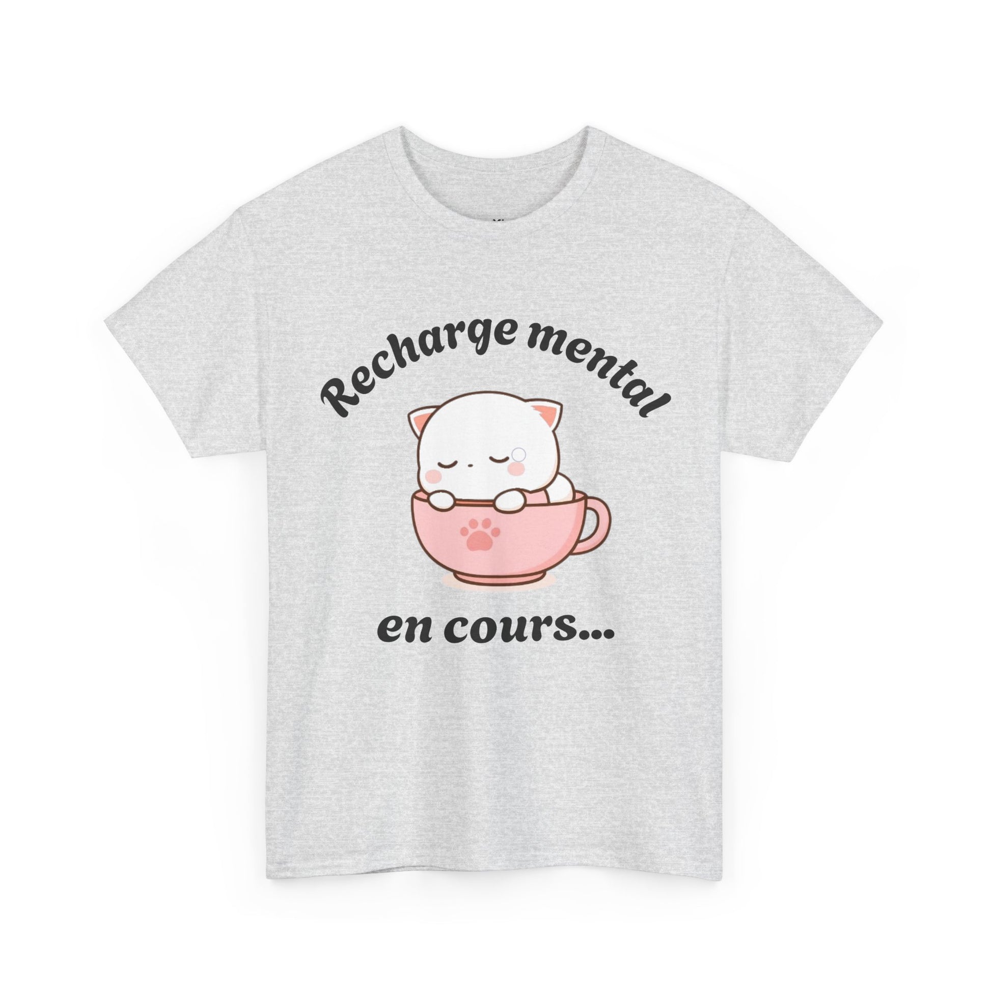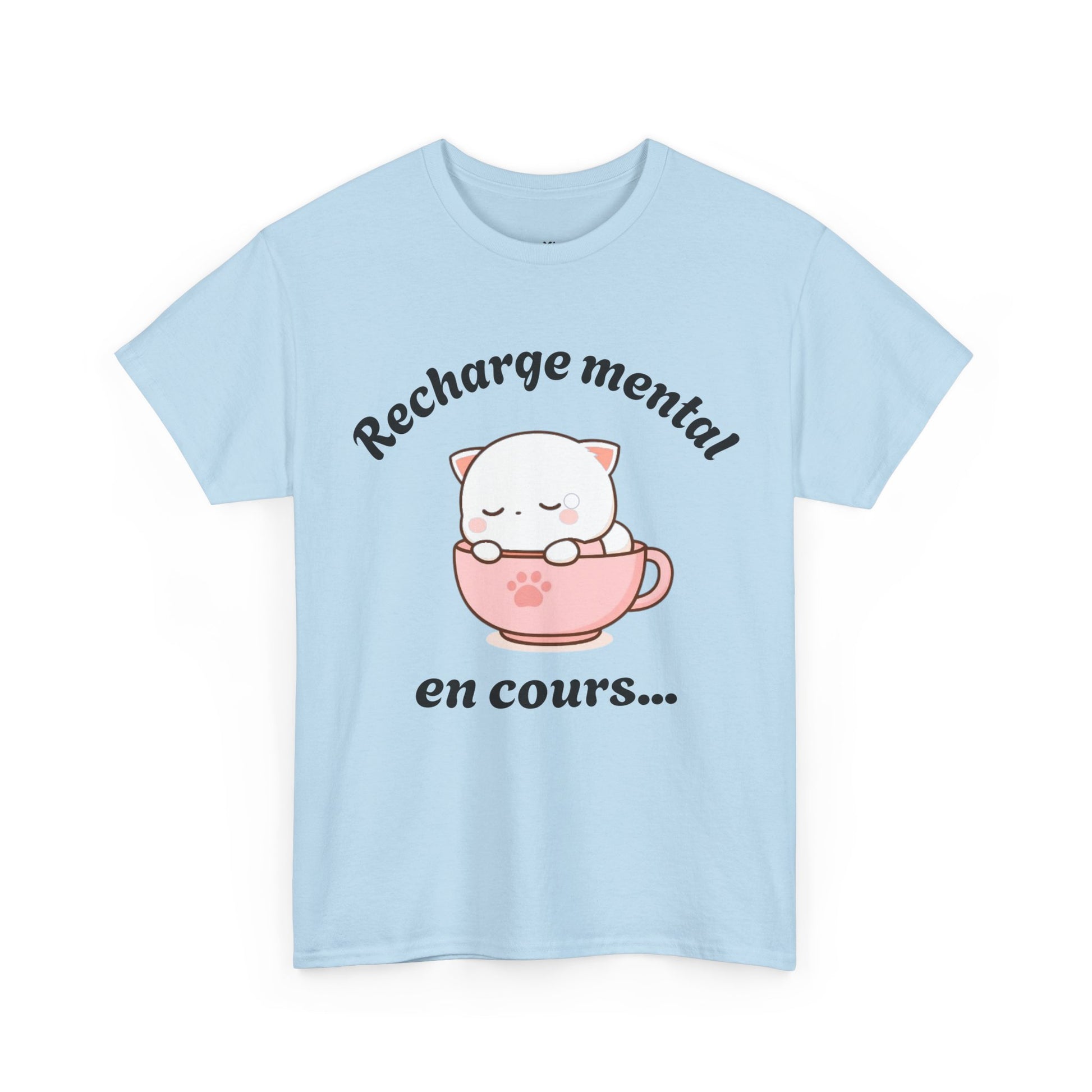 T-shirt unisex 100% coton "Recharge mental en cours..." avec notre adorable petit chat.
