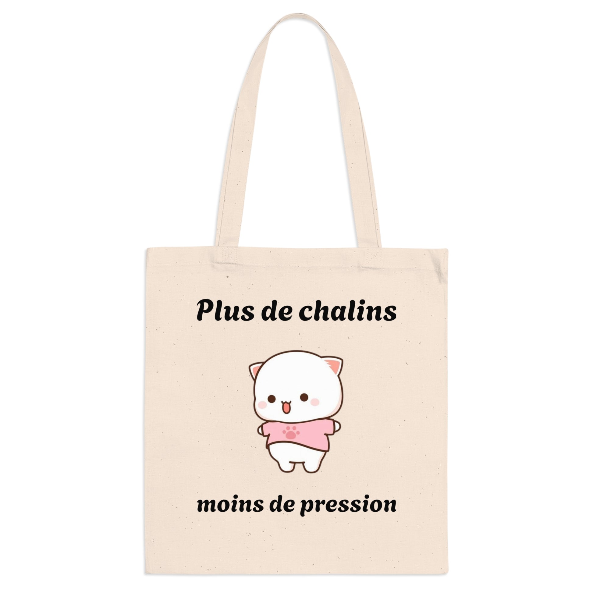 Tote bag 100% coton, couture renforcé "Plus de chalins, moins de pression" avec notre adorable petit chat.